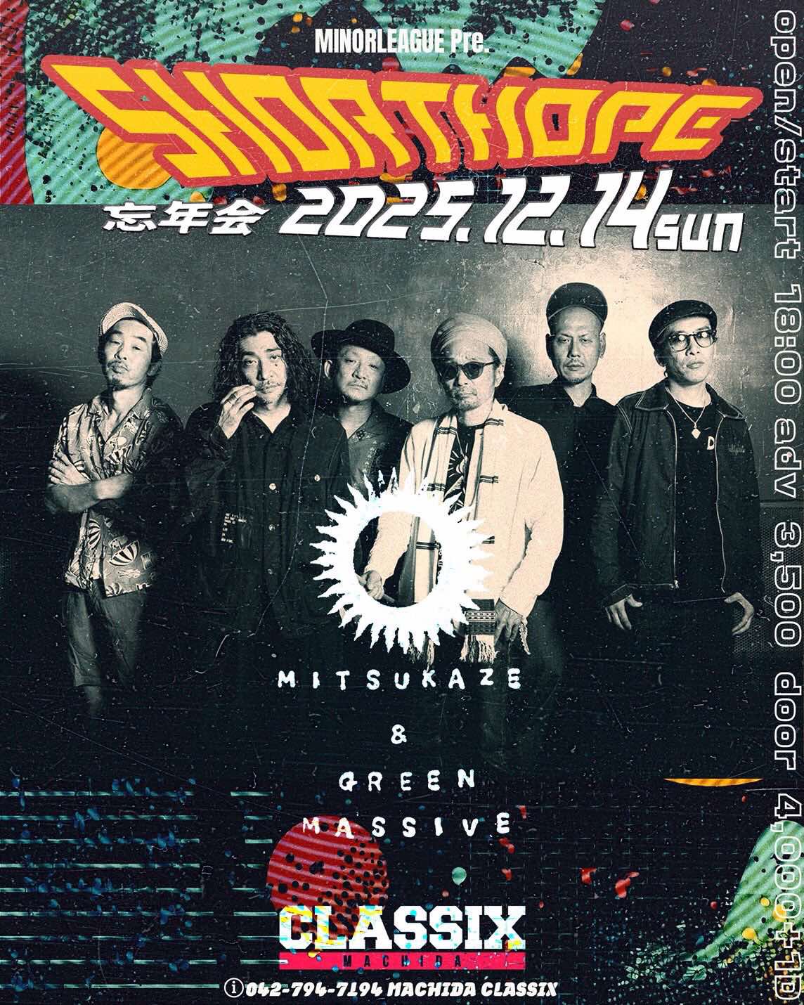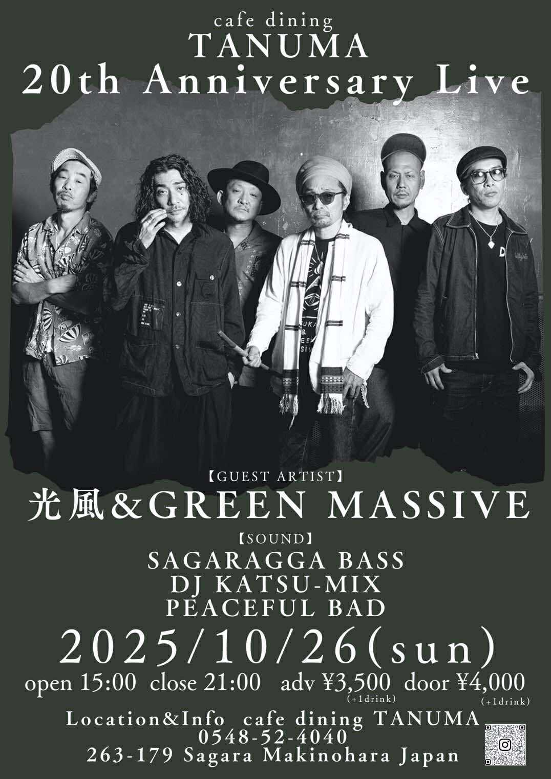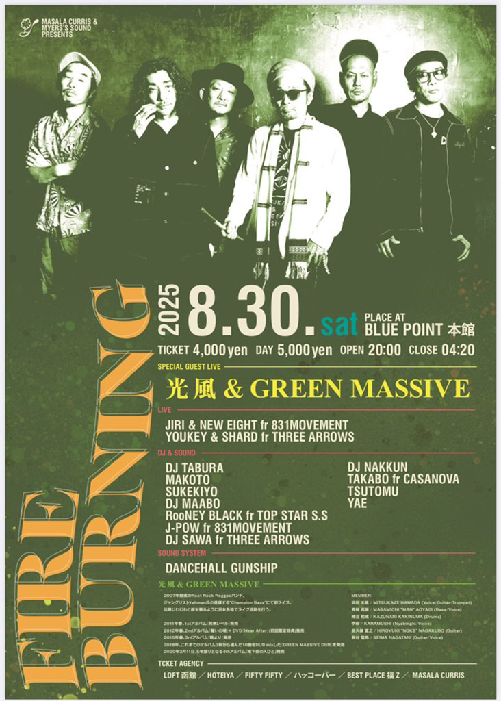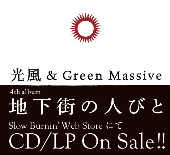News 2025.1.9(Fri) 飲暴論 vol.2『遊益』ヱヰ十 feat.J-REXXX RELEASE PARTY~ at 新宿LOFT MORE INFO 2025.12.14(Sun) MINOR LEAGUE pre. “SHORT HOPE” at 町田CLASSIX MORE INFO 2025.11.29(Sat) 結ノ島CAMP 2025 at 奄美大島マングローブパーク内(住用町道の駅) MORE INFO 2025.11.23(Sun) SHOW MON RAI FUKU at 大阪泉佐野THE YELLOW SHRIMP MORE INFO 2025.11.22(Sat) at 京都METRO MORE INFO 2025.10.26(Sun) at 静岡相良 cafe dining TANUMA MORE INFO 2025.10.25(Sat) FREEDOM JAPAN FESTIVAL 2025 at 朝霧ハートランド牧場 MORE INFO 2025.10.12(Sun) Roaring LION at 石川白山パーク獅子吼ふれあい館 MORE INFO 2025.10.11(Sat) PEACE CAMP 2025 at ひだ舟山リゾートアルコピア MORE INFO 2025.9.14(Sun) 24周年記念無料ライブ –弁天ROCKERS– at 江ノ島Oppa-la MORE INFO 2025.9.7(Sun) at 愛知豊田VIVROX MORE INFO 2025.9.6(Sat) 皆神山POWER SPOT 2025 at 長野皆神神社 MORE INFO 2025.8.31(Sun) at 札幌BOOTY MORE INFO 2025.8.30(Sat) at 函館BLUE POINT本館 MORE INFO "地下街からのメッセージ" 光風 & Green Massive 4枚目のアルバム 「地下街の人びと」 2年前にダブアルバムを リリースしライヴを 行った場所が地下であり 今作のレコーディング場所も 地下であった為に このようなタイトルになった。 わずか4日間でレコーディングされた 曲たちは鬼才、内田直之氏の 手によってミックスされ 音の弾丸と化す。 個々の活動もそれぞれ多い メンバー達が集い スタジオリハを重ね 5年ぶりに放つ モノトーンな中にも 輝きを感じる短くも 鋭く濃厚なアルバム。 そして日本の ミュージックシーンでは 少なくなってしまった 日本語による メッセンジャースタイル。 今作には オリジナルメンバー 長久保 "NGKB" 寛之 (exotico de lago) もギターで全曲に参加。 アルバムを聴いた「瞬間」の 感覚を大事にして欲しいと 思うと共に僕らの メッセージが多くの人々の 心に刺さることを 切に願う。