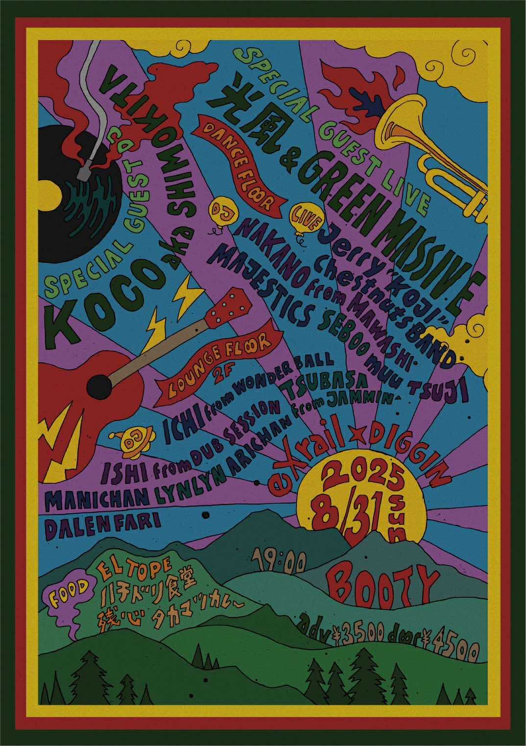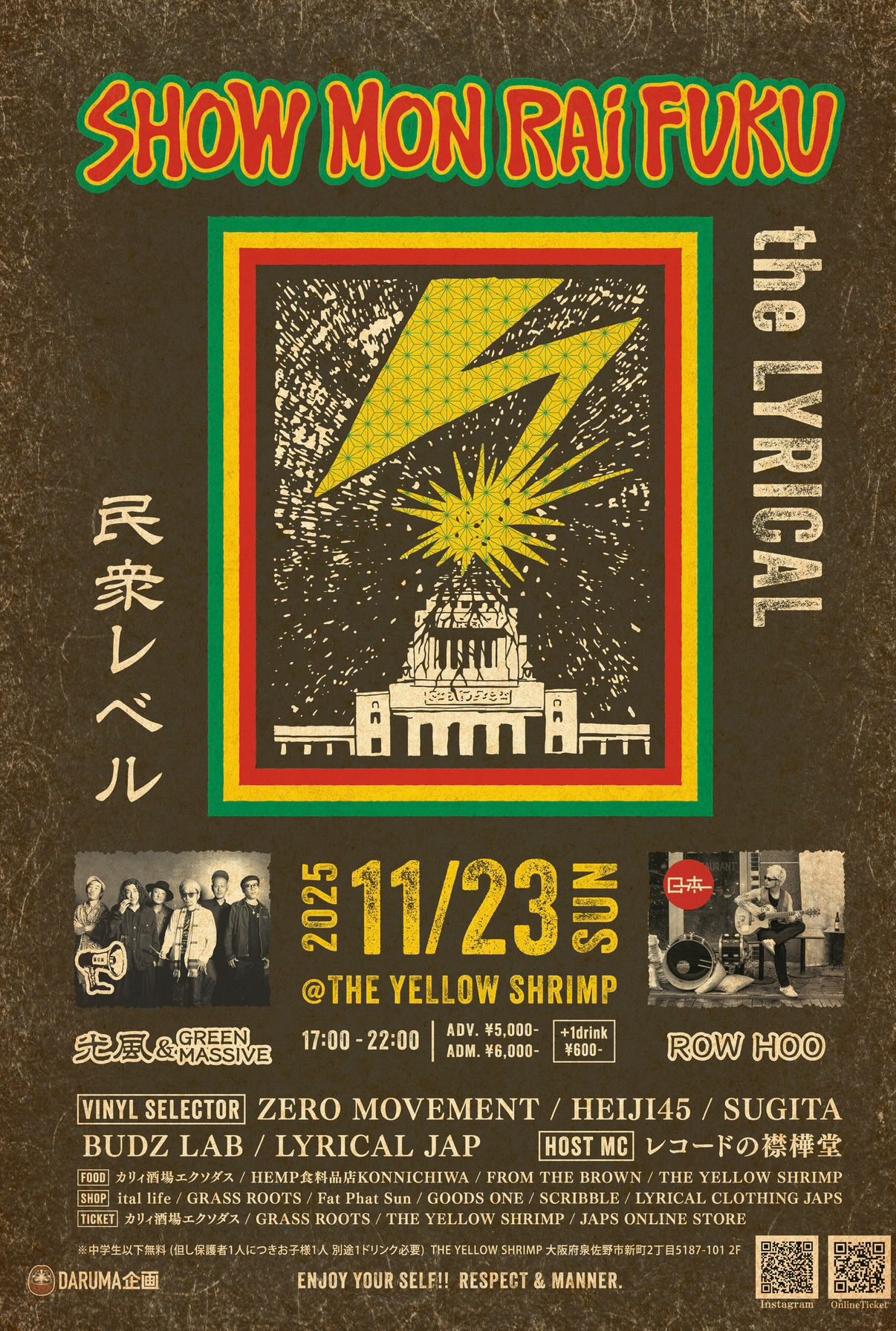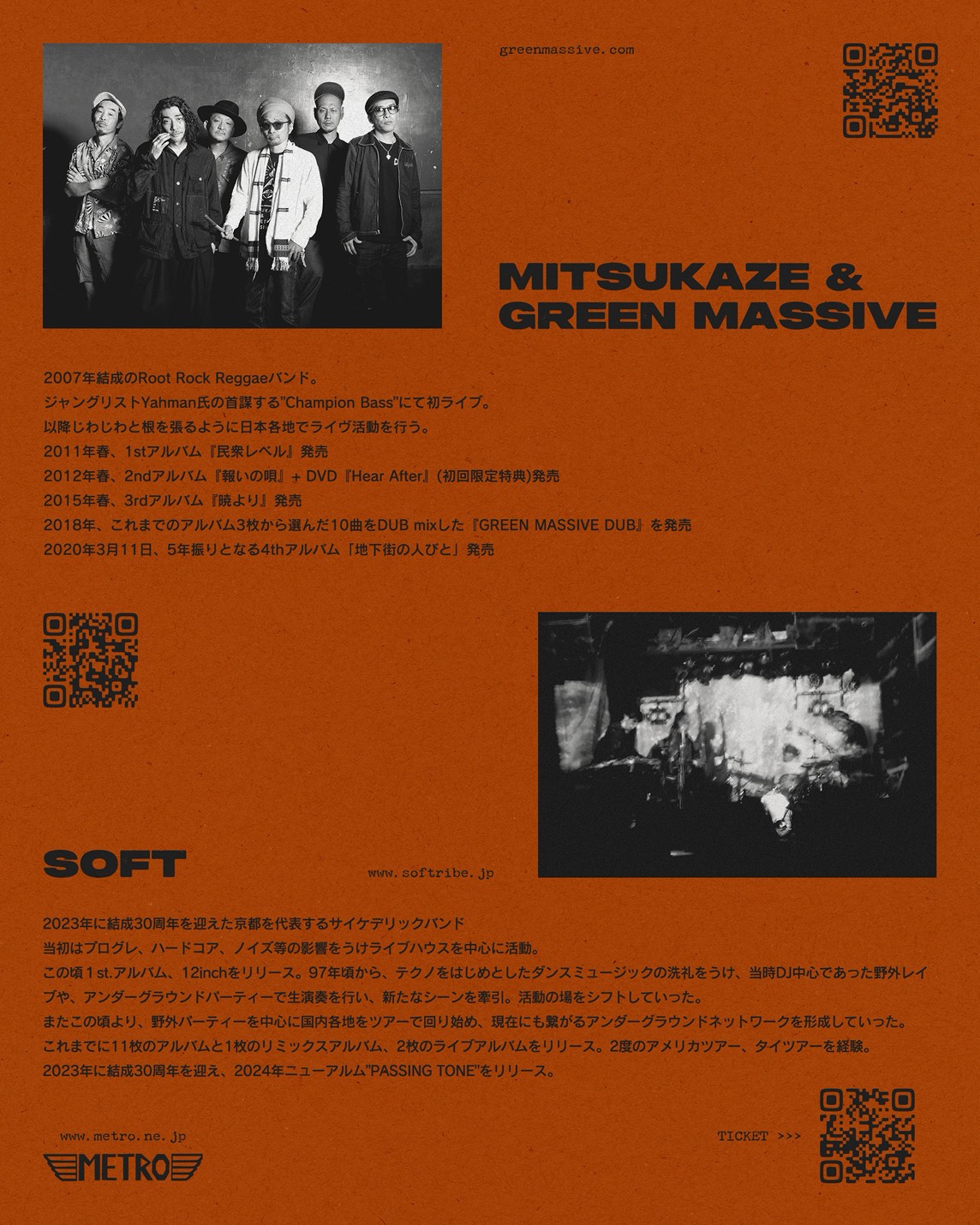 News 2025.1.9(Fri) 飲暴論 vol.2『遊益』ヱヰ十 feat.J-REXXX RELEASE PARTY~ at 新宿LOFT MORE INFO 2025.12.14(Sun) MINOR LEAGUE pre. “SHORT HOPE” at 町田CLASSIX MORE INFO 2025.11.29(Sat) 結ノ島CAMP 2025 at 奄美大島マングローブパーク内(住用町道の駅) MORE INFO 2025.11.23(Sun) SHOW MON RAI FUKU at 大阪泉佐野THE YELLOW SHRIMP MORE INFO 2025.11.22(Sat) at 京都METRO MORE INFO 2025.10.26(Sun) at 静岡相良 cafe dining TANUMA MORE INFO 2025.10.25(Sat) FREEDOM JAPAN FESTIVAL 2025 at 朝霧ハートランド牧場 MORE INFO 2025.10.12(Sun) Roaring LION at 石川白山パーク獅子吼ふれあい館 MORE INFO 2025.10.11(Sat) PEACE CAMP 2025 at ひだ舟山リゾートアルコピア MORE INFO 2025.9.14(Sun) 24周年記念無料ライブ –弁天ROCKERS– at 江ノ島Oppa-la MORE INFO 2025.9.7(Sun) at 愛知豊田VIVROX MORE INFO 2025.9.6(Sat) 皆神山POWER SPOT 2025 at 長野皆神神社 MORE INFO 2025.8.31(Sun) at 札幌BOOTY MORE INFO 2025.8.30(Sat) at 函館BLUE POINT本館 MORE INFO "地下街からのメッセージ" 光風 & Green Massive 4枚目のアルバム 「地下街の人びと」 2年前にダブアルバムを リリースしライヴを 行った場所が地下であり 今作のレコーディング場所も 地下であった為に このようなタイトルになった。 わずか4日間でレコーディングされた 曲たちは鬼才、内田直之氏の 手によってミックスされ 音の弾丸と化す。 個々の活動もそれぞれ多い メンバー達が集い スタジオリハを重ね 5年ぶりに放つ モノトーンな中にも 輝きを感じる短くも 鋭く濃厚なアルバム。 そして日本の ミュージックシーンでは 少なくなってしまった 日本語による メッセンジャースタイル。 今作には オリジナルメンバー 長久保 "NGKB" 寛之 (exotico de lago) もギターで全曲に参加。 アルバムを聴いた「瞬間」の 感覚を大事にして欲しいと 思うと共に僕らの メッセージが多くの人々の 心に刺さることを 切に願う。
